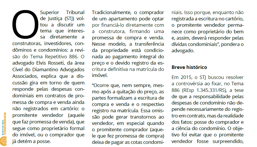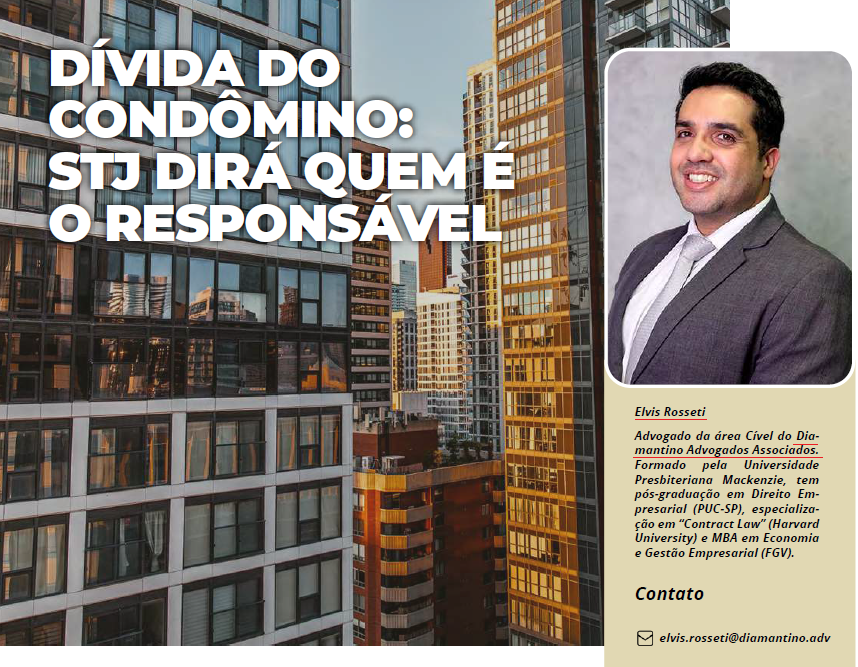 O advogado Elvis Rosseti, da área cível do Diamantino Advogados Associados, teve seu artigo de opinião publicado no portal Revista dos condomínios, sobre a discussão do Tema 886 no STJ, que trata das despesas de condomínio em contratos de promessa de compra e venda.