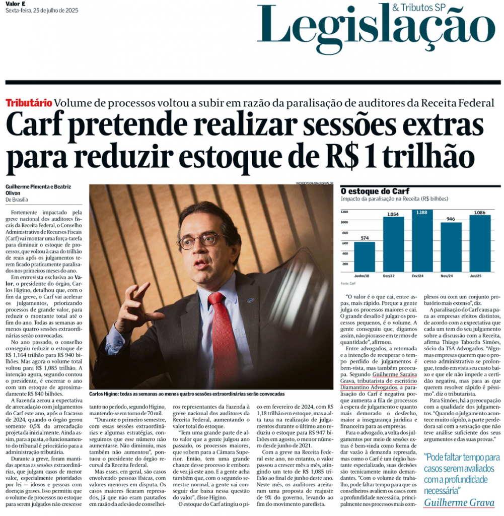 Guilherme Saraiva Grava, advogado tributário do Diamantino Advogados Associados, comentou ao Valor Econômico sobre o impacto da greve nacional dos auditores fiscais da Receita Federal. Como medida para enfrentar o acúmulo de processos que voltou a ultrapassar R$ 1 trilhão — o Carf irá montar uma força-tarefa com sessões extraordinárias, buscando destravar os julgamentos paralisados nos primeiros meses do ano.